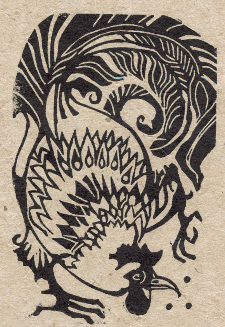 It was a small piece of lino that I came across in my drawer that I used to cut this cockerel. As I worked on it, I had in mind the Japanese netsuke carvings, where all the carving is contained within a small piece of ivory.